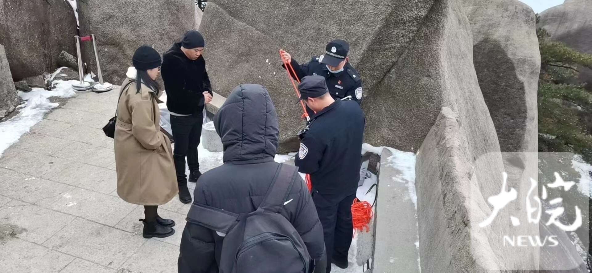 天柱山景區(qū)執(zhí)法大隊主峰景區(qū)中隊隊員葛臣第一時間趕往現(xiàn)場。經(jīng)查看,發(fā)現(xiàn)懸崖陡峭,高達10米,加上那段時間正值大雪天氣,懸崖結(jié)冰打滑,無法施救。吳女士又撥打110尋求幫助。接報后,茶莊派出所兩名輔警到達現(xiàn)場,仍無法施救。經(jīng)商議,吳英同意放棄施救,下山回到嘉興。